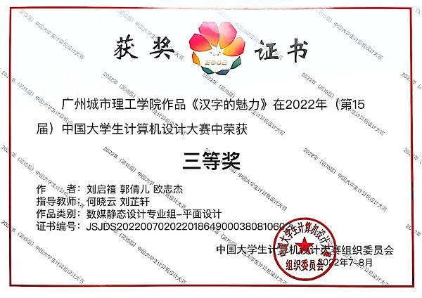 大赛以三级竞赛形式开展,分别是校级赛——省级赛(简称“省赛”)——国家级赛(简称“国赛”)。由工业设计专业刘启禧、郭倩儿、欧志杰三位同学共同创作的数媒静态设计专业组作品《汉字的魅力》在六月中旬的省赛中荣获二等奖,并在七月下旬的国赛中荣获三等奖。
