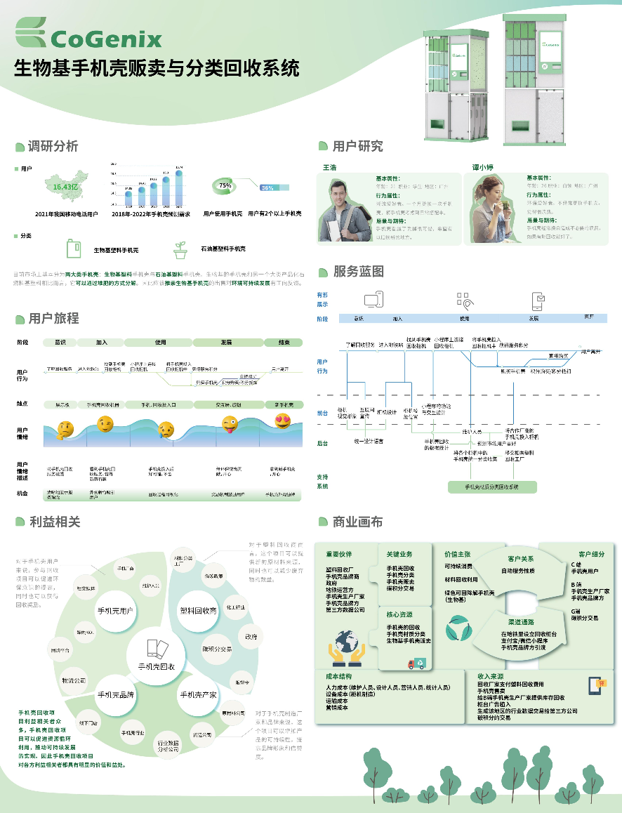 该系统是是一个针对目前国内手机壳回收问题所设计的一套服务系统,此系统主要由投放到地铁出站口的手机壳材料识别回收贩卖机、线上 APP 端和线下终端站构成,用户可以通过使用配套APP 回收各种材质的手机壳,以及购买环保生物基塑料手机壳。