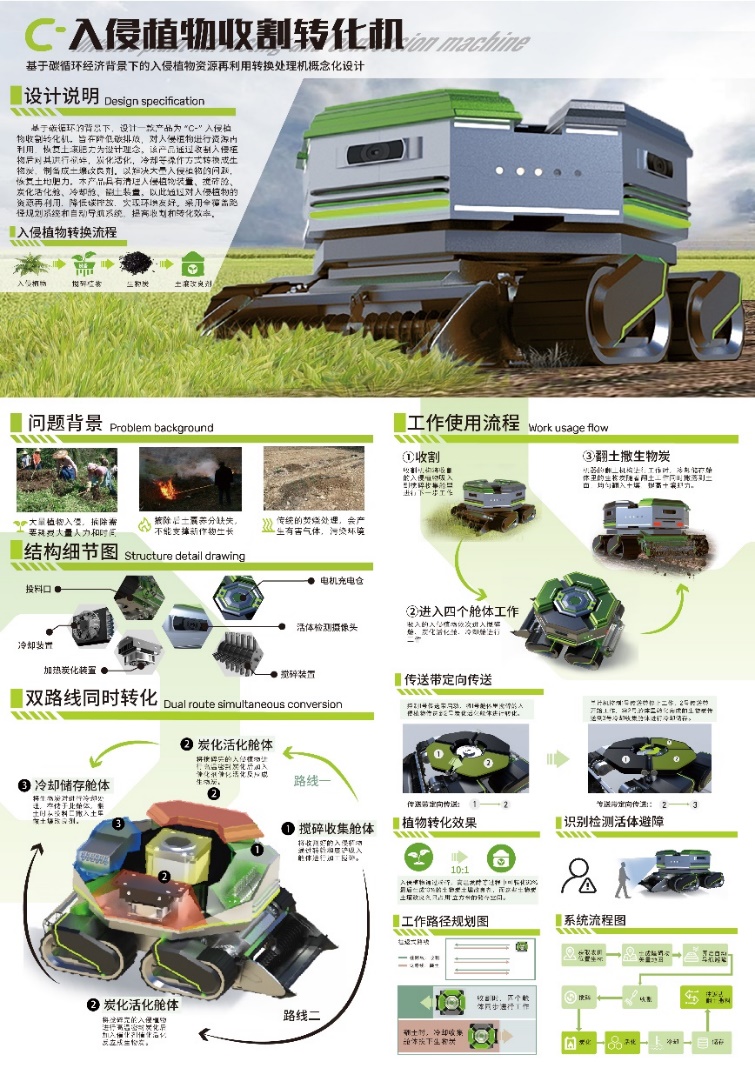 由工业设计教研室教师指导的2021级学生邓婉怡、李莉林和梁萧组成的学科竞赛团队先后获得非命题赛场广东赛区二等奖、非命题赛场国赛一等奖。学生回顾比赛的准备过程,介绍了作品的由来。最开始先明确了设计初衷,由于入侵植物不仅破坏当地生态环境,还影响农作物的生长,所以团队就想设计一款能够高效、环保地处理这些入侵植物的机器。其次,机器需要同时平衡功能性和美观性。设计这款大型器械并不是一件容易的事,首先考虑的是它的功能性,要能够高效地收割入侵植物,还能将这些植物转化为有用的资源。经过多次讨论,团队最终确定了结构和工作原理。在外观上,注重实用性和美观性相结合。机器不仅能够高效地收割入侵植物,还能将它们转化为有机肥料,真正实现资源的循环利用。后来,指导老师鼓励成员们应对自己的作品保持自信,勇敢的去投比赛。对作品要不断打磨,优化细节,不断进步。经过大家共同的努力,终于收获成果。