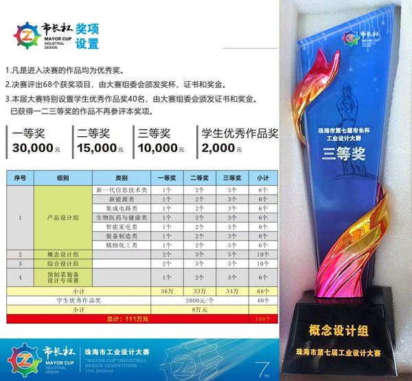 本网讯(记者 梁文峻)为贯彻中共广东省委、广东省人民政府发布的《关于高质量建设制造强省的意见》,聚焦珠海市 “4+3”重点产业集群,促进工业设计与制造业深度融合的精神,6月30日,机械工程学院/机器人工程学院在由珠海市工业和信息化局主办,广东省工业和信息化厅指导,广东省工业设计协会、珠海市工业互联网协会、市内外相关行(专)业的科研机构、社会组织及高等院校等单位承办的第七届珠海市市长杯工业设计大赛中荣获三等奖。