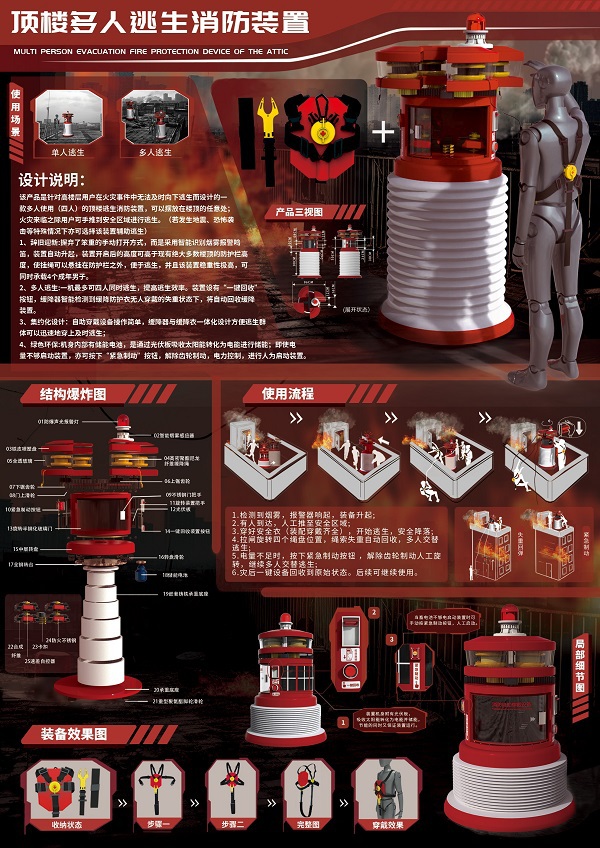 学生回顾比赛过程,一开始的设计初衷是为解决传统逃生救援装置仅能用于个体逃生、充当一次性用具,以及救援不及时等缺点,为此团队希望打造一款新型的集安全、舒适、环保于一体的安全逃生设备。针对传统逃生设备的不足,对急停、速降、多人等多个方面进行改进与优化,并在此基础上提出了失重回收、二次利用、光伏板续航等先进理念,团队设计的产品不仅能够最大程度的对能量高效利用,而且也为逃生人员提供了快速、安全且方便的逃生途径。最后在小组的不断打磨下,使该产品实现了功能与造型的统一,实用性与外观性的结合。
