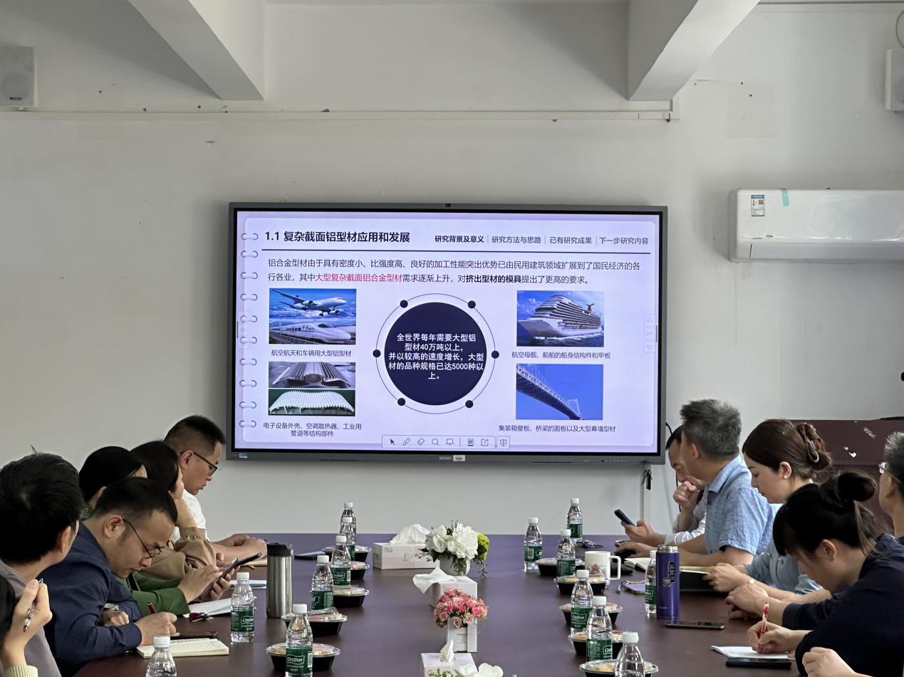 随后,潘健怡作专题学术报告,系统阐述铝型材挤压模具疲劳寿命预测方法研究及应用、生产数据驱动的挤压模关键结构智能设计方法研究两大方向创新研究成果,并分享实践经验。同步系统性梳理学院科研平台优势资源,深度解读教育厅科技相关项目申报指南,动员团队把握产学研协同创新机遇。