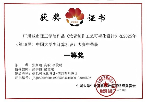 本网讯(记者 梁文峻)8月8日至8月12日,2025年(第18届)中国大学生计算机设计大赛杭州赛区决赛在浙江理工大学杭州校区举行。我校由机械工程学院学生:张家瑜(组长)、高毅、李俊明组成的参赛团队,凭借信息可视化设计作品《青瑗纪——汝瓷信息可视化设计》,在 信息可视化设计赛道中表现出色,勇夺全国一等奖!
