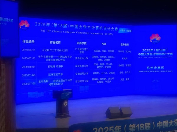 杭州赛区吸引了包括浙江大学、杭州电子科技大学、浙江工业大学等众多省内顶尖高校的数百支队伍同台竞技,竞争异常激烈。为备战此次大赛,学校及高度重视,自该学期初起积极组织动员、开展校内选拔,并为参赛团队配备了强有力的指导教师队伍。张宇博、梁文峻两位指导老师全程悉心指导,在作品选题、技术实现、文化内涵挖掘及答辩准备等环节倾注了大量心血。团队成员通力协作,凭借扎实的专业功底、创新的设计思维和稳定的现场发挥,最终在强手如林的竞争中脱颖而出。