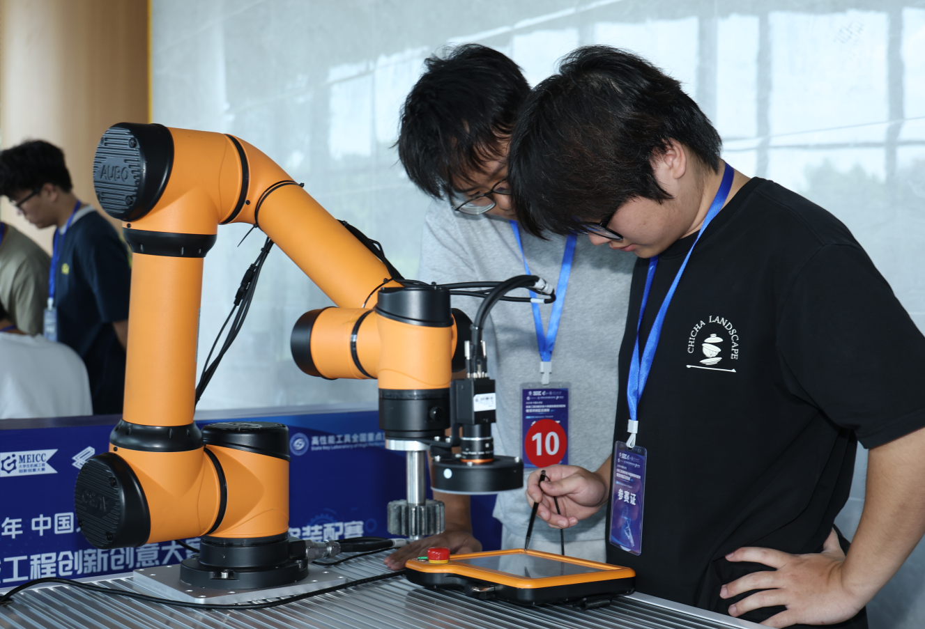 我校由指导教师冯哲带领钟易均、陈宇亮、陈宠仁三位学生参赛,团队依托机械实验中心的开放实验室平台,凭借扎实的专业功底、默契的团队协作,同学们暑假期间加班加点,历时2个月完成机器臂控制与算法优化,首创“力-位混合闭环控制”策略,将装配误差稳定控制在±0.05 mm以内。决赛现场,面对 “异形零件高速抓取”“多轴协同精密装配” 等极具挑战性的任务,队员们沉着应对、稳步操作,最终出色完成了项目呈现。