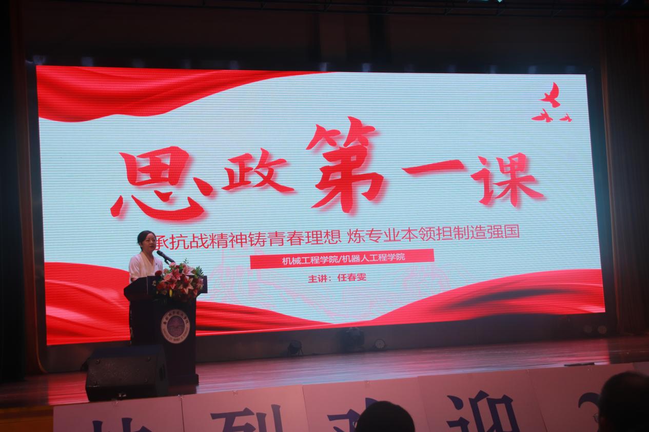 最后,任春雯为新生讲授主题为“赓续抗战精神勇担智造使命”的思政第一课。她以中国人民抗战胜利纪念日为契机强调唯有铭记历史、传承精神,才能在新时代的征程中勇担使命机械工程学院/机器人工程学院的学生要以抗战精神为“精神坐标”,筑牢科技报国的理想信念;以专业学习为“实践路径”,锤炼科技强国的过硬本领;以服务社会为“价值导向”,践行科技为民的初心使命。