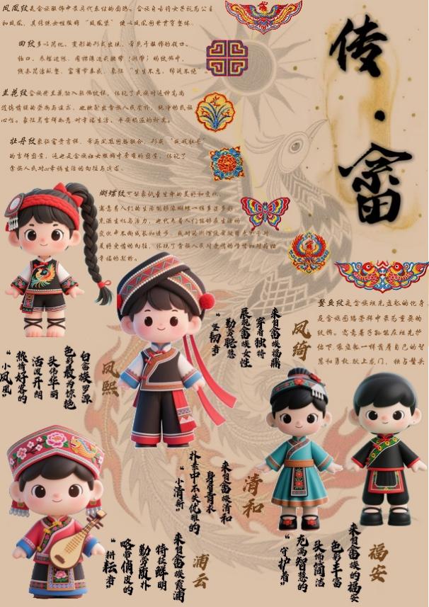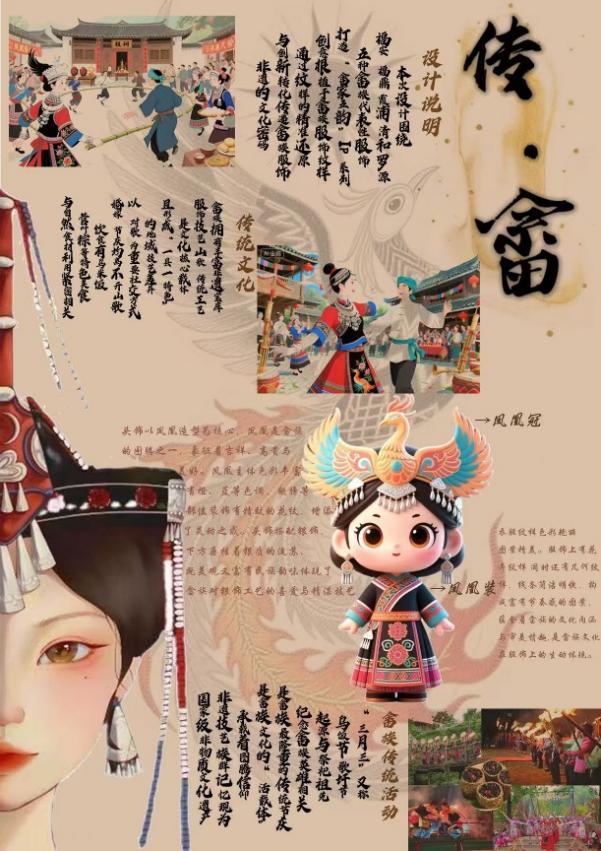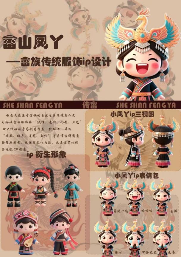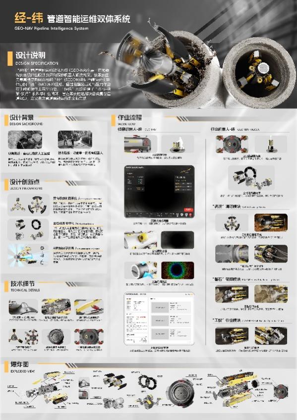 在本届竞赛中,由工业设计教研室杨伟健老师指导,王海月、陈思雅、陈晓颖、宁婉婷、曹志聪学生团队创作的作品《传畲·畲山凤丫》荣获广东赛区一等奖,作品充分展现畲族非遗服饰技艺、传统工艺等文化载体,采用“Q版写实结合“的画风,既保证服饰细节清晰,又具备萌感和亲和力,让非遗文化”同龄化IP“实现有效传递。由学院工业设计教研室冯颖老师指导,林荣鑫同学创作的作品《“经纬”管道智能运维双体系统》凭借其前瞻的设计理念和完整的系统化解决方案,在众多作品中脱颖而出,荣获广东赛区三等奖。