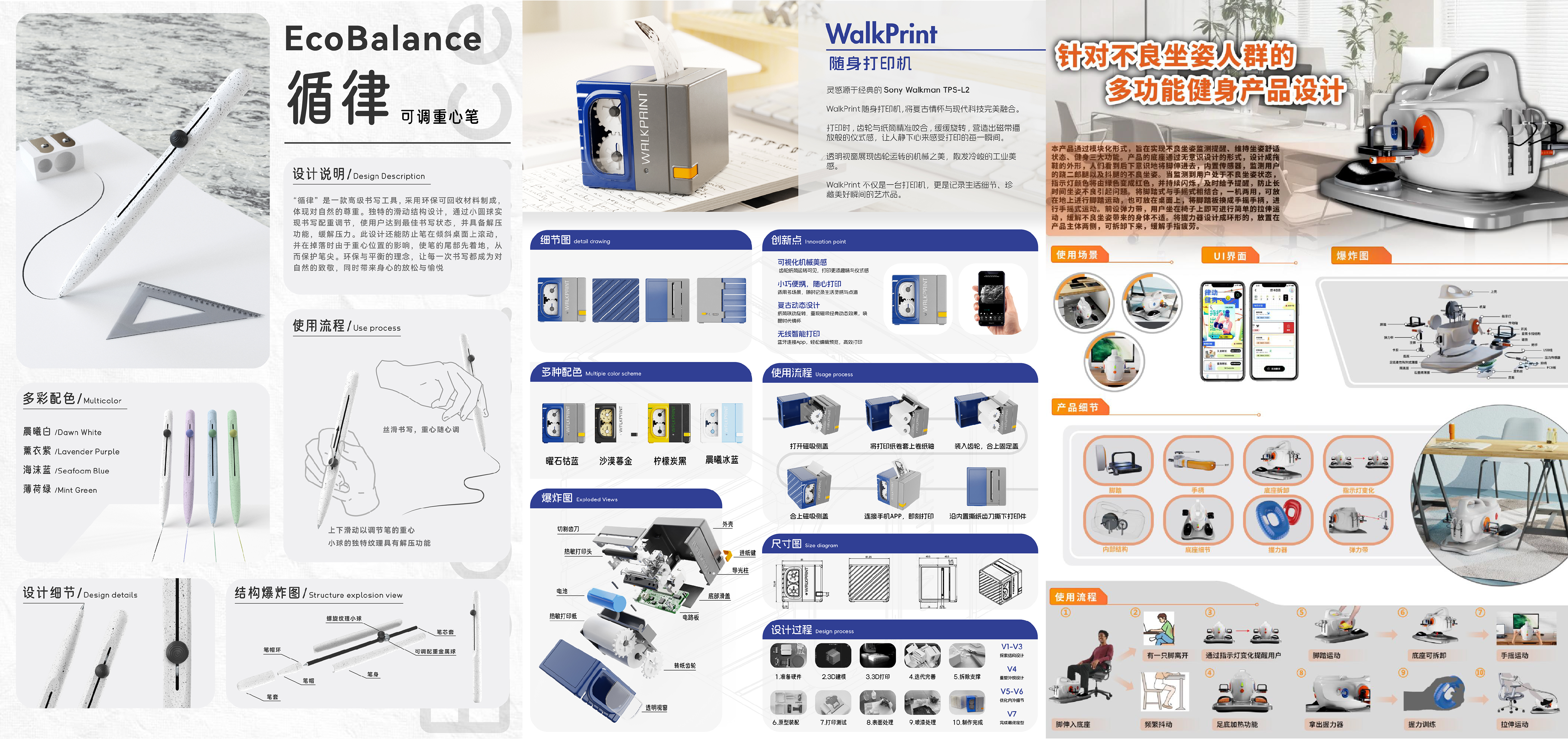 在产品设计类赛道中,由张晓宇老师指导,范成智同学设计的《循律 可调重心笔》;冯颖老师指导,蔡弼光同学设计的《针对不良坐姿人群的多功能健身产品设计》;陈家托老师指导,林荣鑫、范成智团队设计的《WalkPrint 随身打印机》,斩获3项二等奖。这些作品不仅关注用户体验的细节优化,更将环保理念与现代科技巧妙融合,展现了工业设计的务实价值。