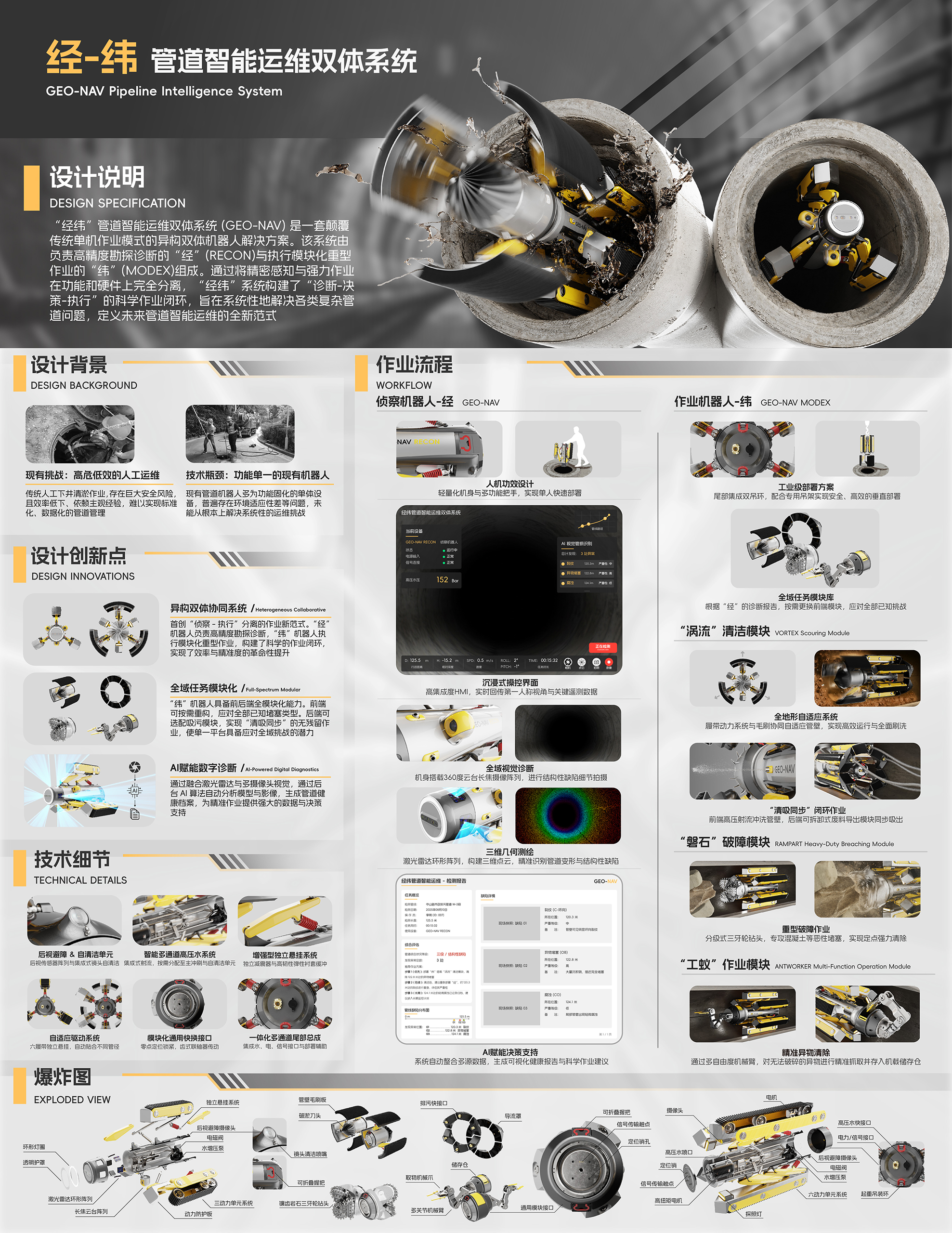 在本届双年展中,由冯颖老师指导,林荣鑫同学创作的作品《“经纬”管道智能运维双体系统》荣获产品设计类一等奖。该作品立足于城市地下基础设施维护的实际痛点,提出了一种极具前瞻性的异构双体协同作业模式,其完善的工程逻辑和创新的设计理念获得了评审专家的高度认可。