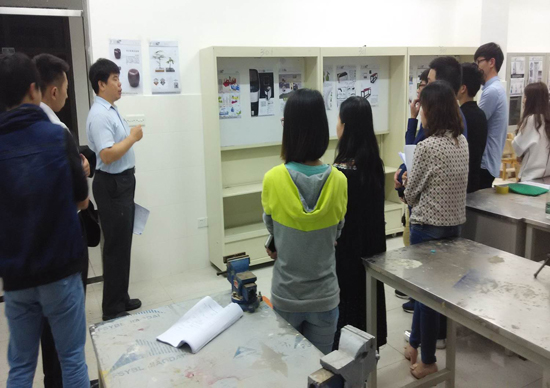 工业设计专业效仿了台湾树德科技大学生活产品设计系的中期答辩做法,每一位学生把自己的展板粘贴在墙上然后为每位教师进行讲解,导师在学生讲解完后进行提问,学生答辩,导师给学生提出建议。答辩期间,刘博士向工业设计专业教师介绍了他所在系里的答辩经验和要求。