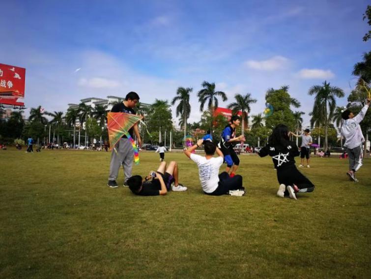 秋风起,落叶也被吹回原位,大学生们似乎回到了童年,他们拿出风筝,系上风轮,一人手举风筝奔跑,一人捏轮牵线紧跟,两人合作将风筝放飞,草坪内外充满了快活的空气。大家都回到了小时候,表面多成熟的人,这时候全像小孩子,有些同学甚至还购买泡泡液吹起了泡泡,五彩缤纷的泡泡伴随着风筝一起飞往天空,引来一群孩子们玩耍,此时此景和记忆中的童年重叠,大人和小孩的界限似乎被模糊了。