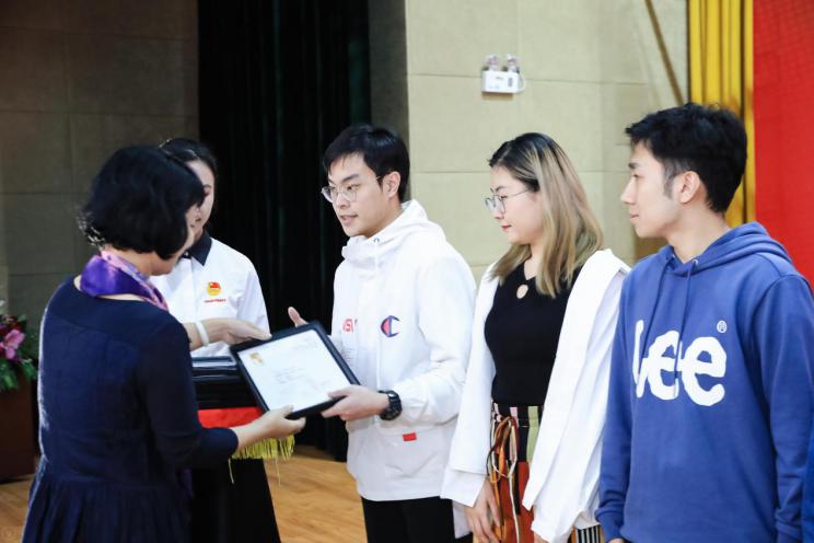 我校机械学院广东赛区一等奖的作品《难为情》,学生代表朱言昊同学上台领奖。以及机械工程学院全国大学生广告艺术大赛的指导老师梁文峻老师,获得此次大赛的优秀指导老师。