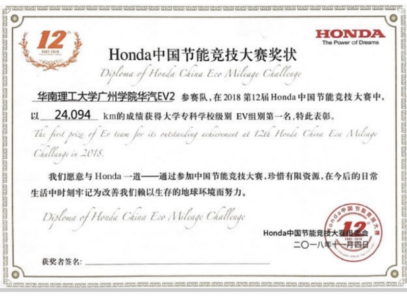 2018第十二届Honda中国节能竞技大赛获奖
