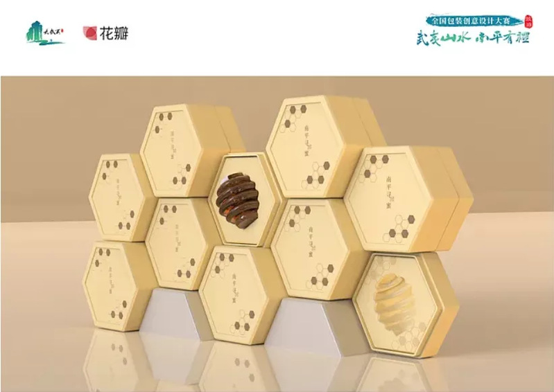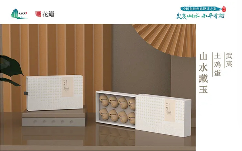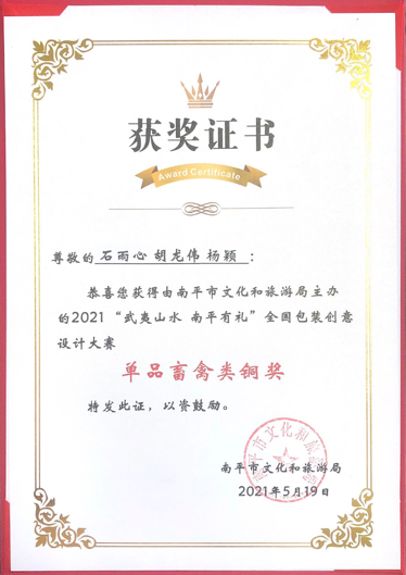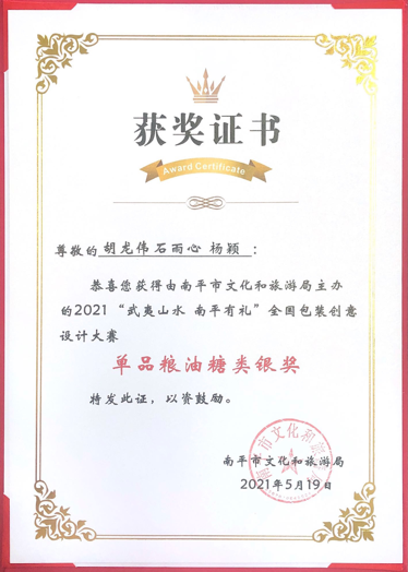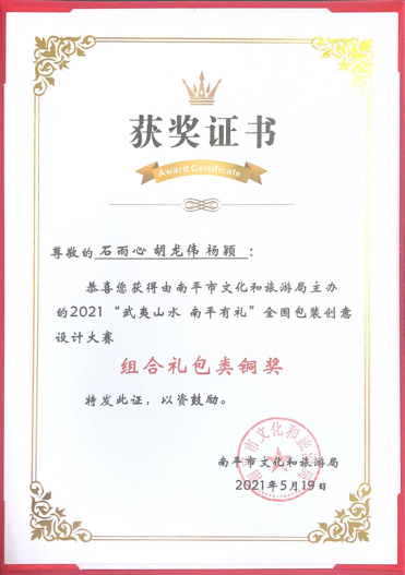 2021年5月19日经过大赛组委会评审,石雨心和胡龙伟同学体现了设计的乐趣,传达了内心的理念,绽放创意之光,为青春增添色彩。用简洁的线条勾勒出灵性的空间,让我们能够在产品包装中感受武夷山的山光水色、人文风光。运用了巧妙的结构造型设计和包装的美化装饰设计,准确提取武夷山的元素,为武夷山的各类产品进行包装设计,让产品包装更具有意象和故事。