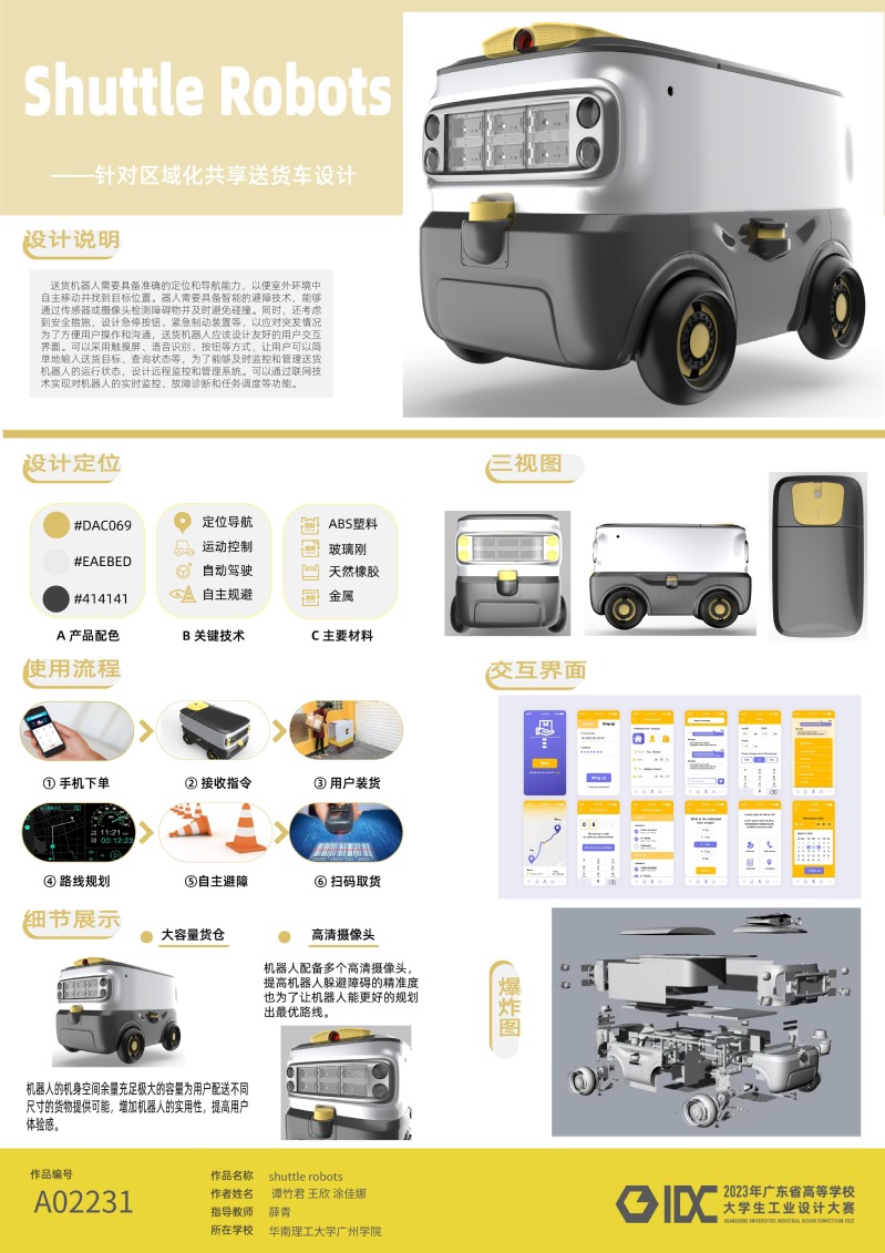 本网讯(记者梁文峻)工业设计专业在今年的广东省高等学校大学生工业设计大赛(由广东省教育厅和广东省本科高校工业设计专业教学指导委员会主办,属于广东省本科高校十大竞赛之一)中获奖数量大幅提升,冯颖、张熠、何晓云、梁文峻、薛青老师指导的学生团队获得了优异的成绩,共获得了10项广东省奖项,包括广东省一等奖1项,二等奖4项,三等奖4项,优秀指导教师奖1项,其中竞赛团队指导教师冯颖和张熠老师被评为优秀指导教师。