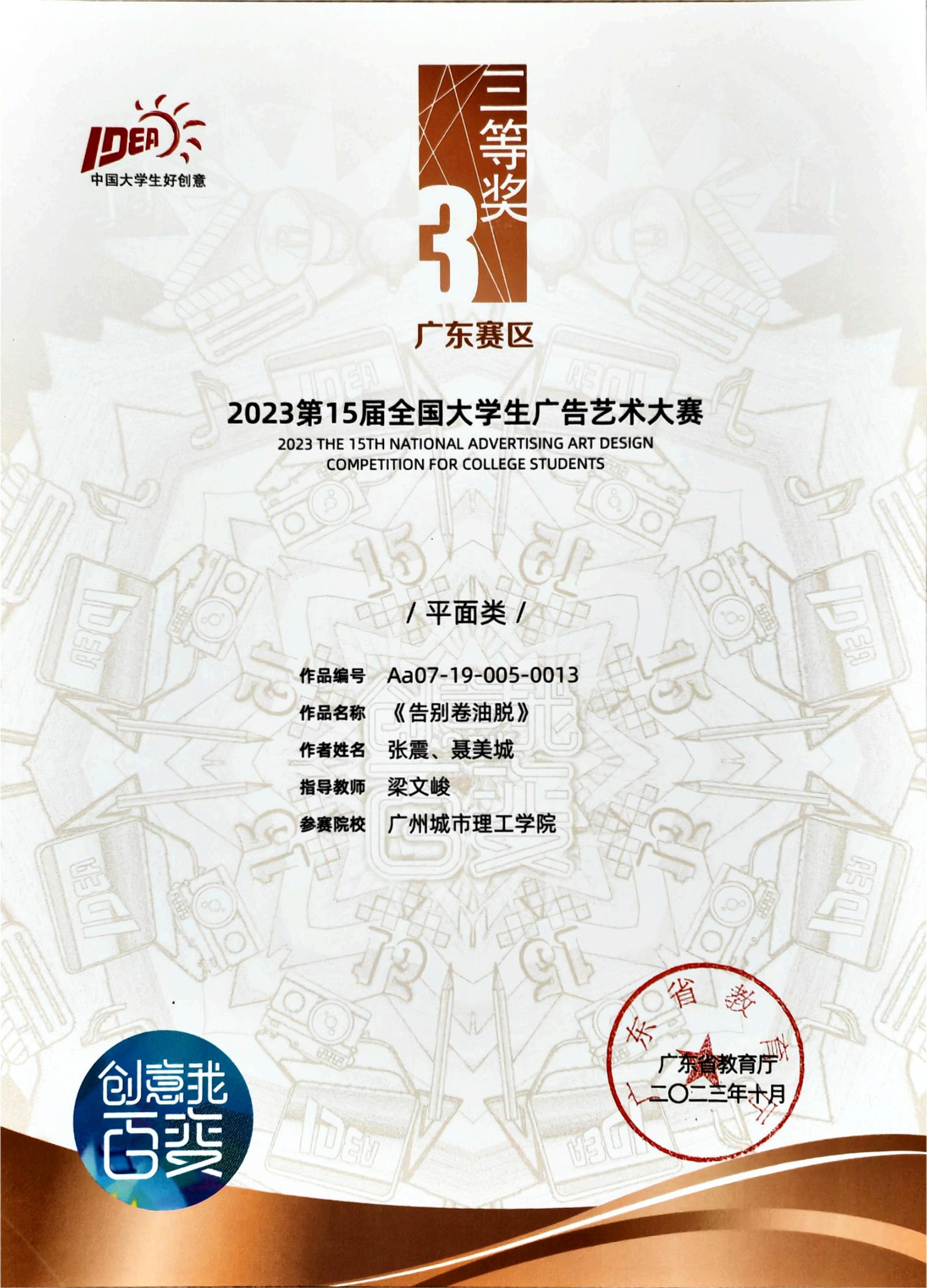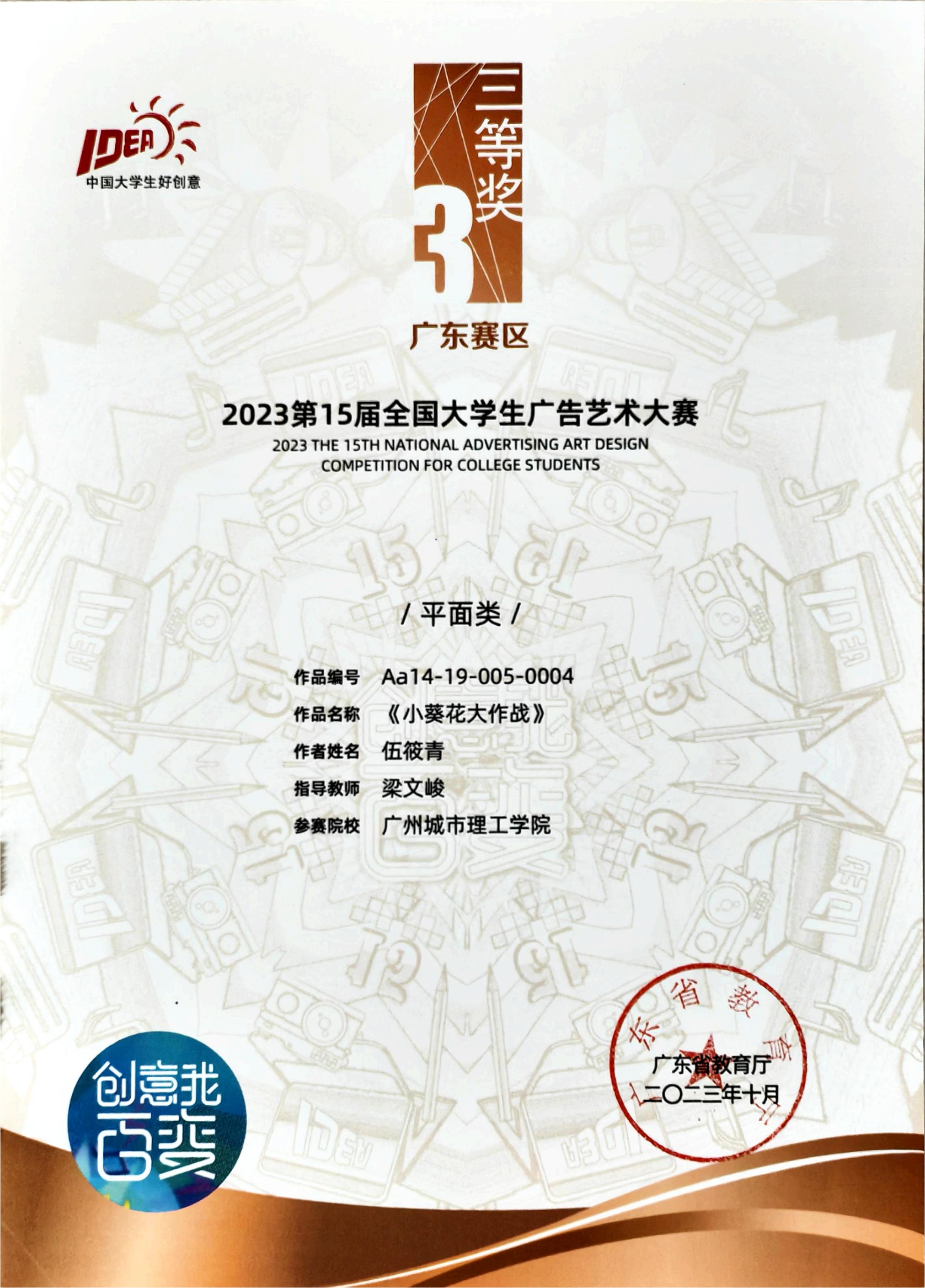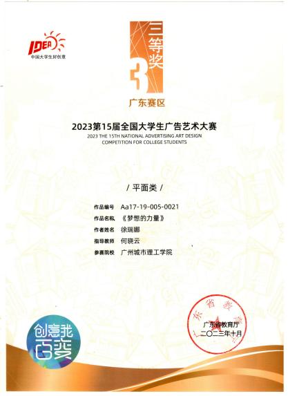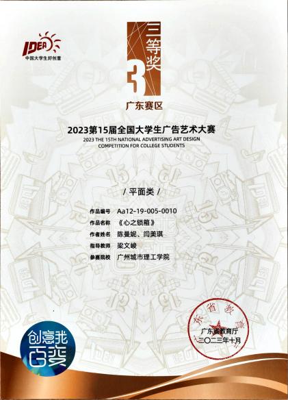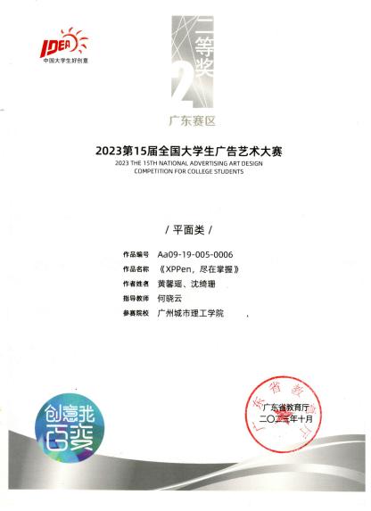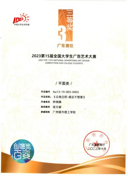 我院工业设计专业何晓云老师指导的学生黄馨瑶、沈绮珊、徐瑞娜在平面类比赛中获得二等奖1项、三等奖1项,梁文峻老师指导的学生钟琬琳、张震、闫美琪在平面类比赛中获得三等奖3项。获奖学生钟琬琳同学表示很荣幸在第15届全国大学生广告艺术大赛广东赛区中获奖,要感谢大赛提供了这么好的平台,让他们拥有了展现和发挥的机会。同时也要感谢学校的培养和老师的悉心指导和帮助。这个奖项对他们来说是一份肯定和鼓励,也是对他们努力付出的认可。他们会继续努力学习和提升自己的设计能力,创作更多更好的作品。