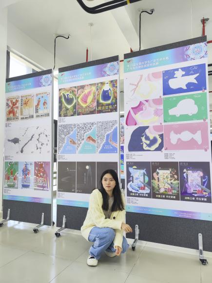 获奖学生在自己的作品前拍照(左)、学生参观获奖作品展览(右)(梁文峻 提供)
