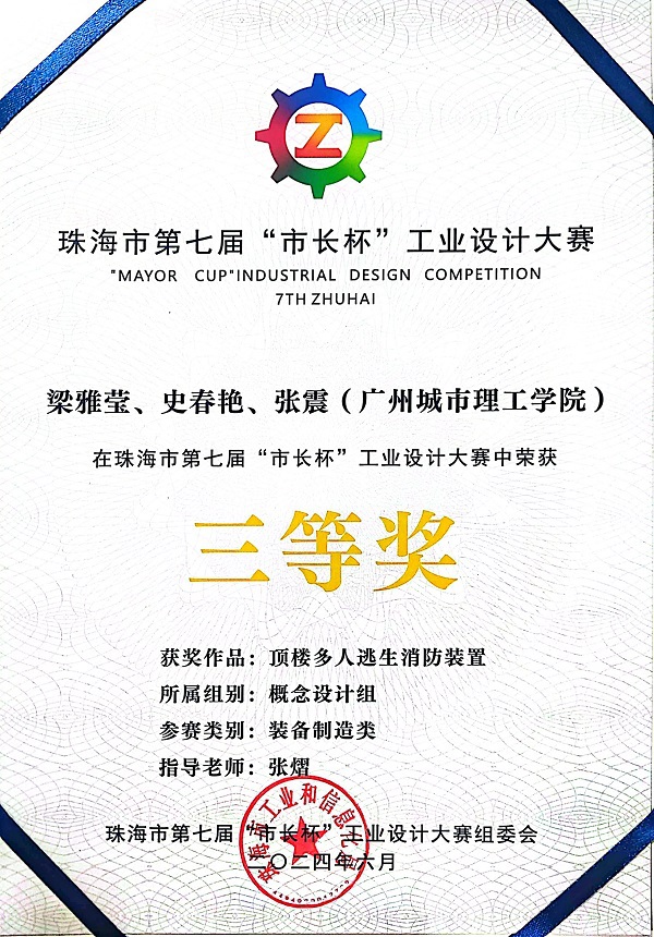 据悉,根据大赛要求,作品内容要求健康向上,突出学校设计教育教学成果,反映创新思维和创新能力、专业特色和教学水平,体现学校设计教学与文化发展的有机衔接。本次获奖作品属概念设计组,类型是紧急逃生,彰显了我校师生的消防意识与对我校生命财产安全的重视。学院将继续发挥大赛对工业设计专业建设和教学改革的引领作用,坚持“以赛促教,以赛促学,以赛促改”的育人理念,致力于为国家和社会培养更多出色的高素质人才。