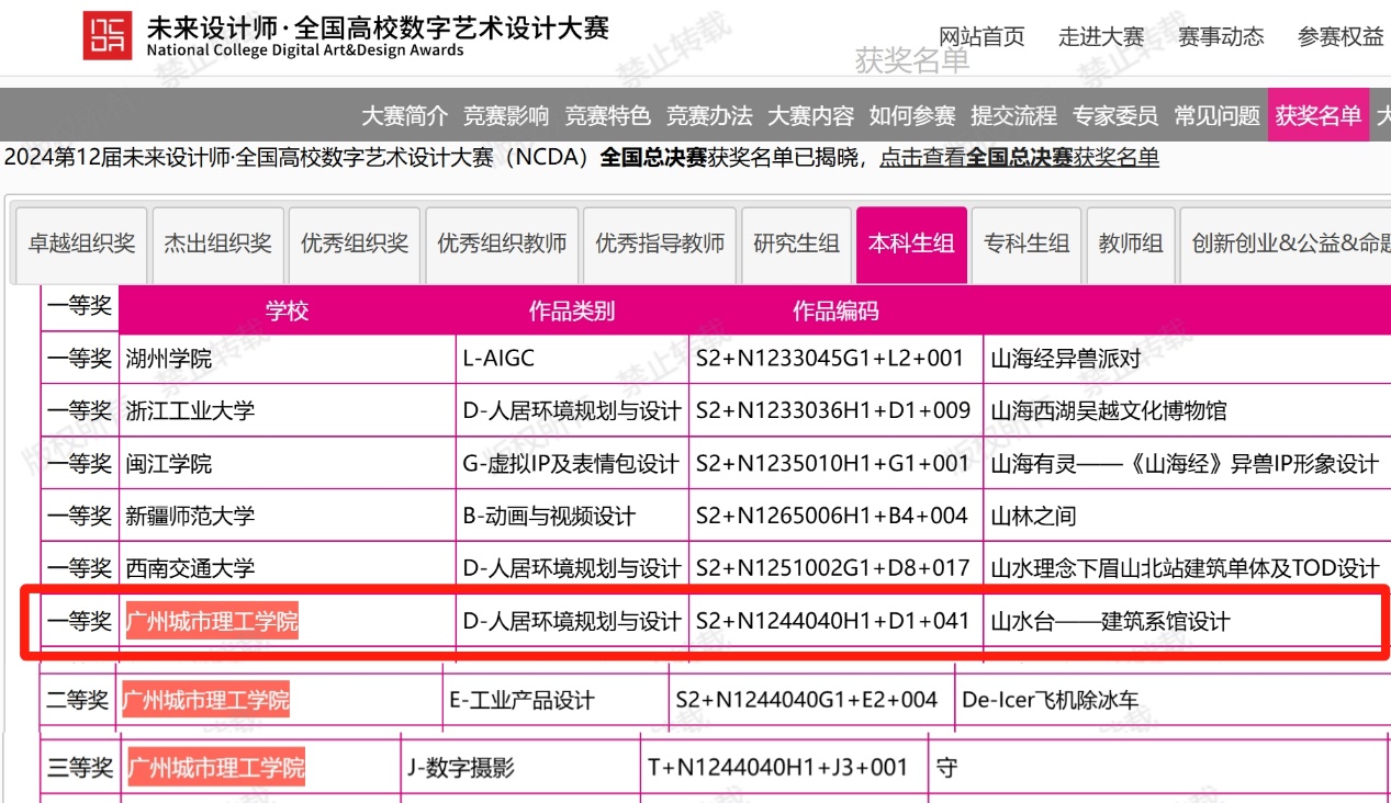 本网讯(记者 陈磊)8月26日,2024年第十二届未来设计师·全国高校数字艺术设计大赛(NCDA)全国总决赛获奖名单正式揭晓。我校建筑学院学生建筑设计作品获全国总决赛一等奖1项,机械工程学院学生工业设计作品获全国总决赛二等奖1项,建筑学院教师数字摄影作品获教师组全国总决赛三等奖1项。其中建筑学院学生一等奖作品还获得了由联合国教科文组织主办的IIDA国际创新设计大赛晋级资格。