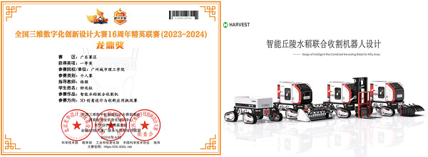 此外,获奖作品《丘陵地区智能水稻联合收割机器人设计》的三维模型在另一项赛事——全国三维数字化创新设计大赛16周年精英联赛(2023-2024)龙鼎奖中也获得了省级一等奖,进一步证明了我校设计教学的卓越成就和学生的创新精神。