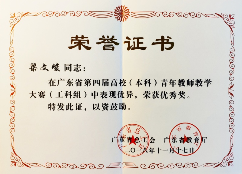 梁文峻副教授获广东省第四届高校(本科)青年教师教学大赛(工科组)优秀奖