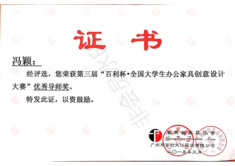冯颖副教授获第三届“百利杯全国大学生办公家具创意设计大赛”优秀导师奖