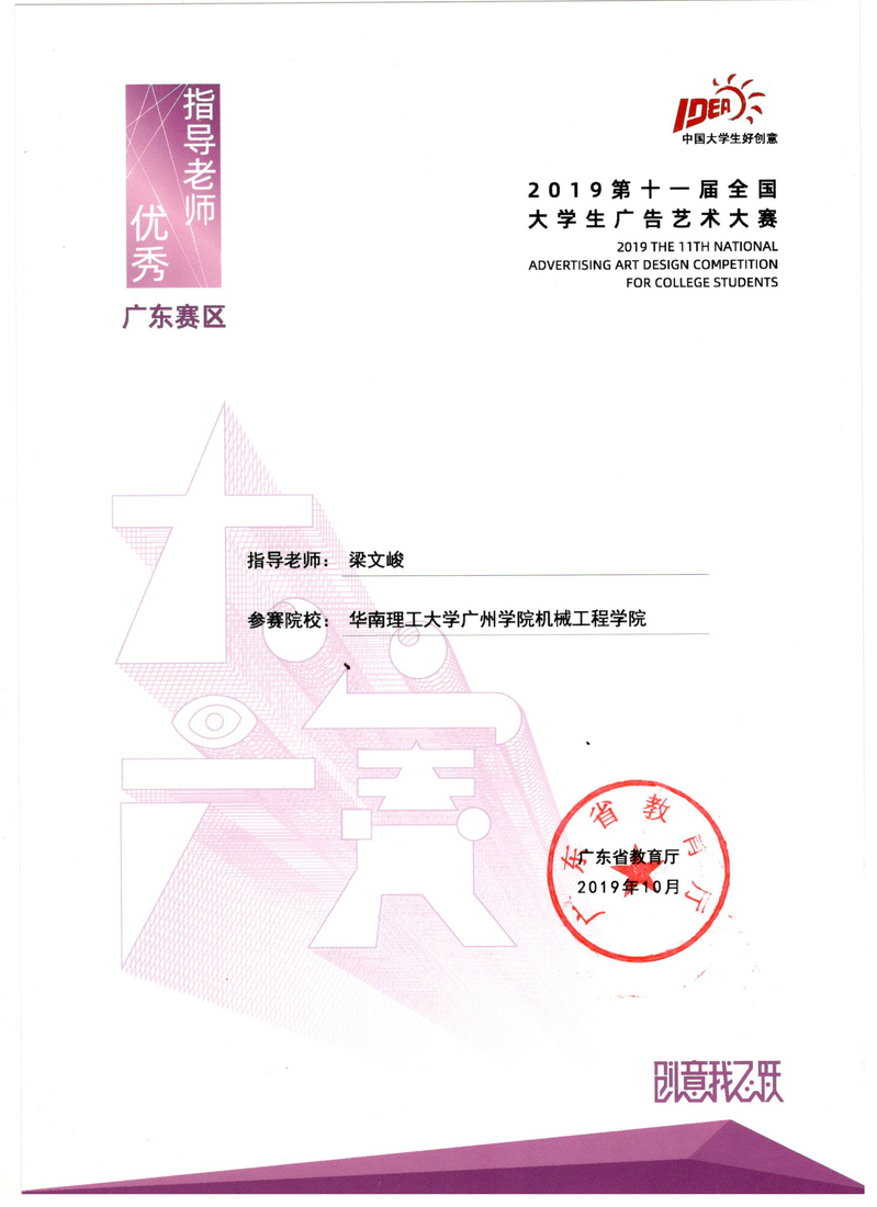 梁文峻副教授获2019第十一届全国大学生广告艺术大赛广东赛区优秀指导老师