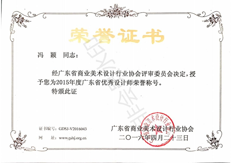 冯颖副教授获2015年度广东省优秀设计师荣誉称号