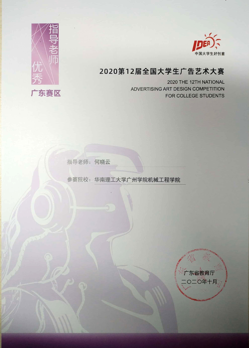 何晓云老师获2020第12届全国大学生广告艺术大赛广东赛区优秀指导老师