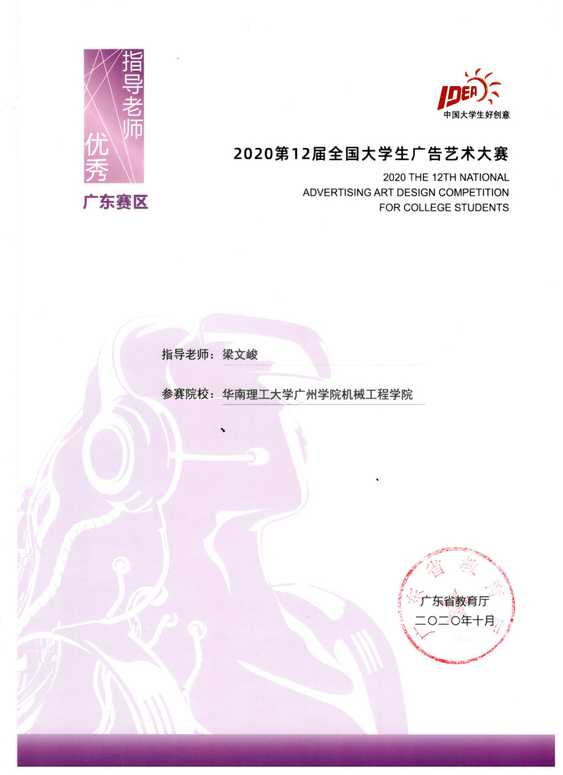 梁文峻副教授获2020第12届全国大学生广告艺术大赛广东赛区优秀指导老师