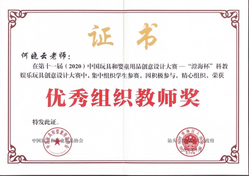 何晓云老师获第十一届(2020)中国玩具和婴童用品创意设计大赛--“澄海杯”科教娱乐玩具创意设计大赛优秀组织教师奖
