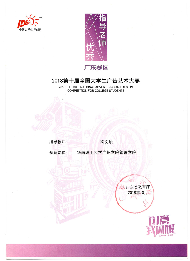 梁文峻副教授获2018第十届全国大学生广告艺术大赛广东赛区优秀指导老师