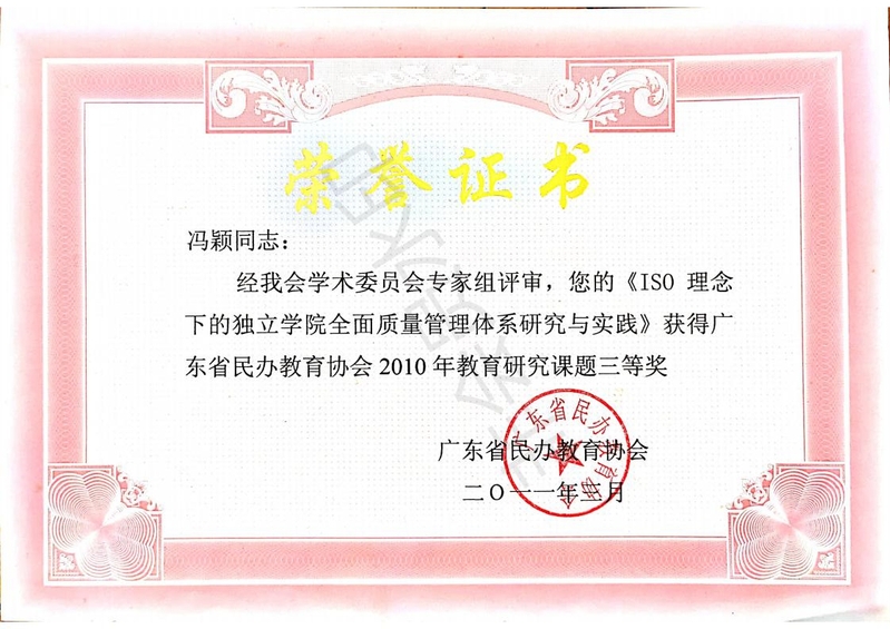 冯颖副教授获广东省民办教育协会2010年教育研究课题三等奖