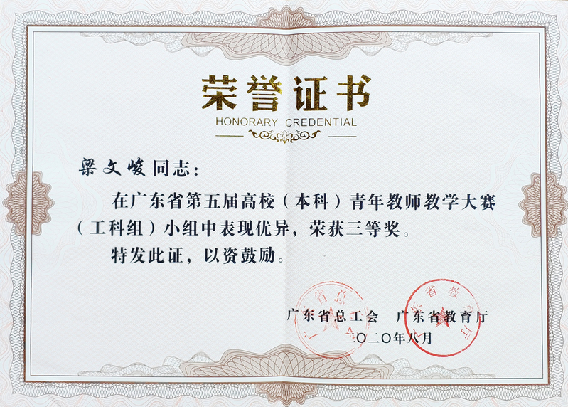 梁文峻副教授获广东省第五届高校(本科)青年教师教学大赛(工科组)三等奖