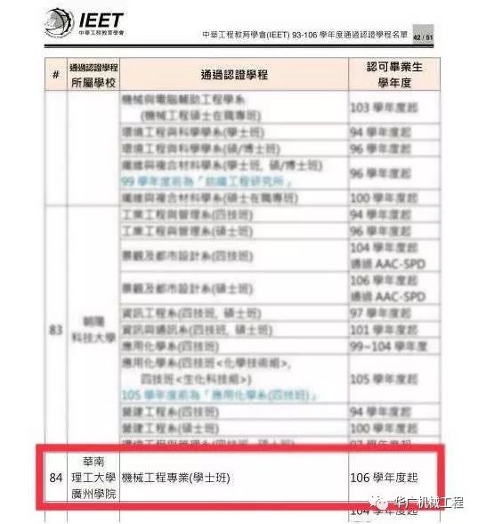 2月25日,IEET驻粤联络处公布了广东省2017年度IEET工程及科技教育认证结果,我校机械工程专业顺利通过IEET工程教育认证,通过期3年(认证第一周期,最高通过期为3年),这是我校首个通过工程教育认证的专业,我校专业认证工作取得了开门红。