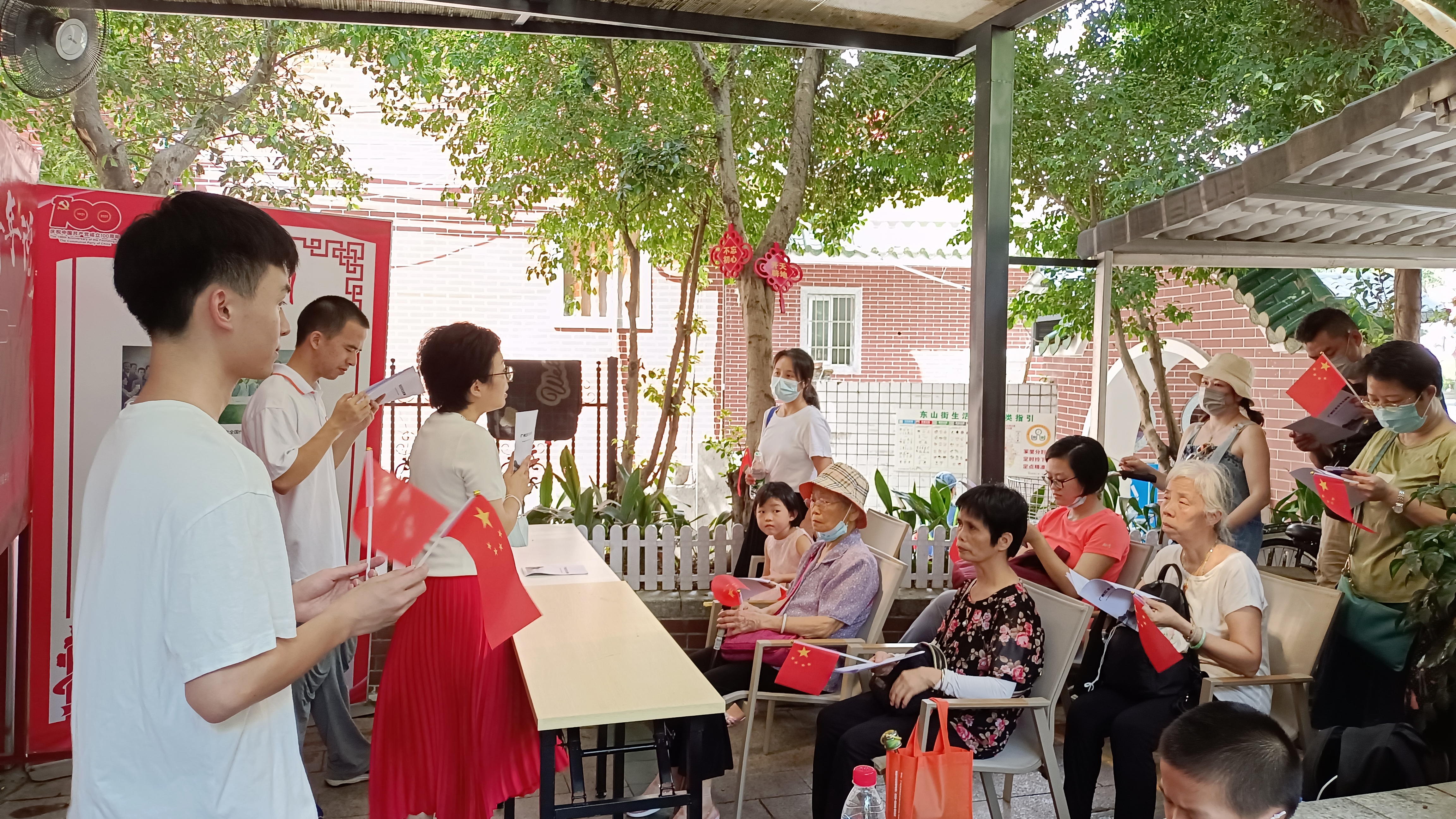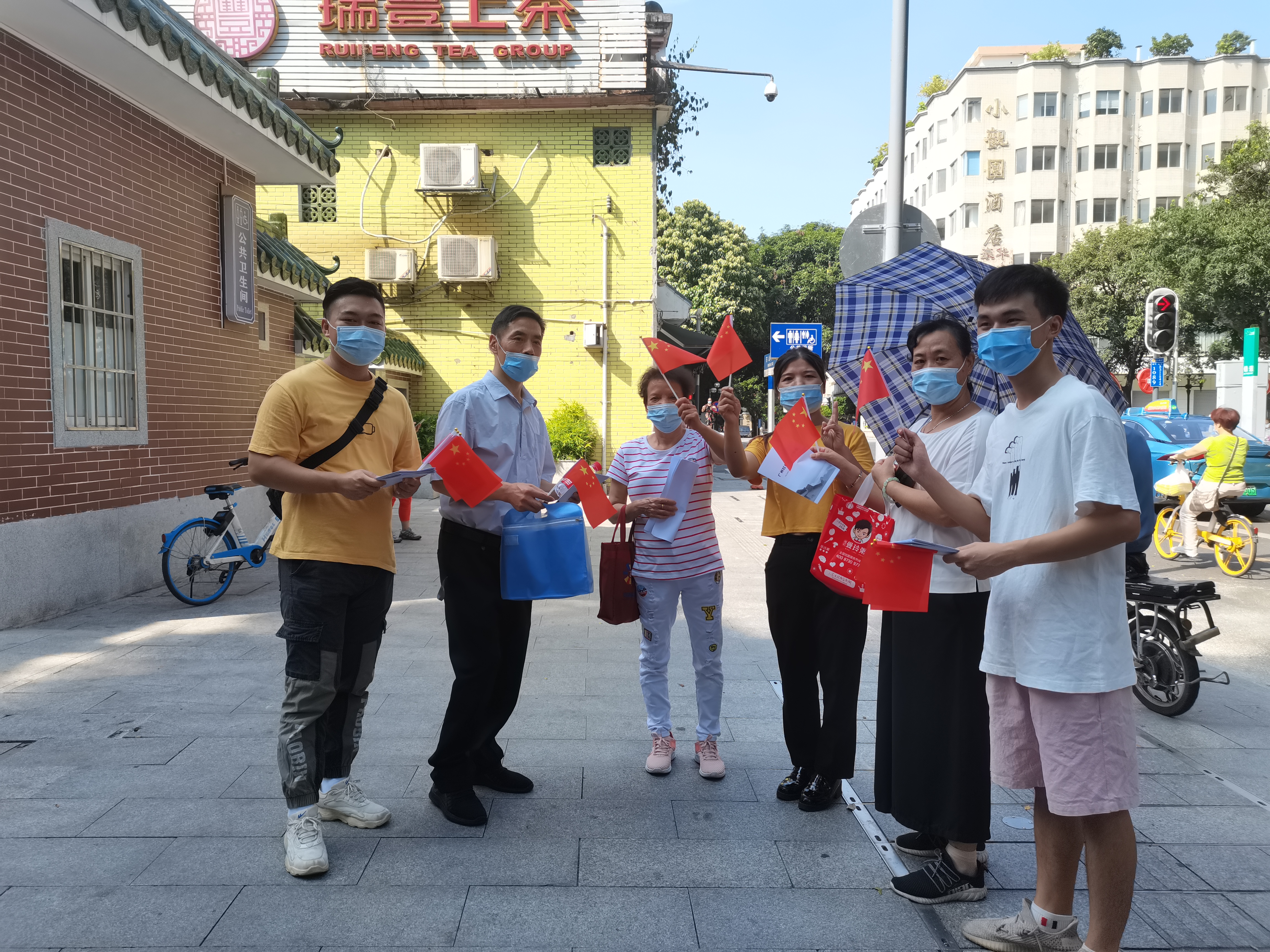 广州红色小故事册的派发则以人流量多的龟岗市场路口为重要宣传点。故事册由MOVE团队选取前期参观学习的11个广州爱国主义教育基地的相关文化故事,结合收集的网络资料,经过反复遴选故事、推敲文字,编纂而成。共分为两个篇章,第一篇章为背景知识介绍,第二篇章为人物故事介绍,依据人物重要性先后讲述了“中共三大为什么选择在广州召开”“广州工人运动”“爱读书的毛泽东”“彭湃,农民运动大王”“为官清廉的杨匏安”“萧楚女,最温暖的烛光”等9个故事。夏日炎炎,团队成员面带微笑一边向社区居民发放故事册和小国旗,一边耐心细致地向社区居民介绍故事册中的红色故事。尽管汗水打湿了衣襟,但能带动社区居民了解学习红色文化,他们乐在其中。