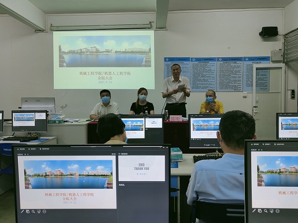 本网讯(记者 朱奥雪)机械工程学院/机器人工程学院为部署学院本学期工作,督促指导全体教职工为学院发展发挥积极作用,9月16日下午,在B8-306召开了全院大会,此次大会是领导换届后学院第一次全院性大会。学院院长邵明、书记任春雯,副院长姜立标、邓达强,全体教职工共90余人参加会议。会议由任春雯主持。