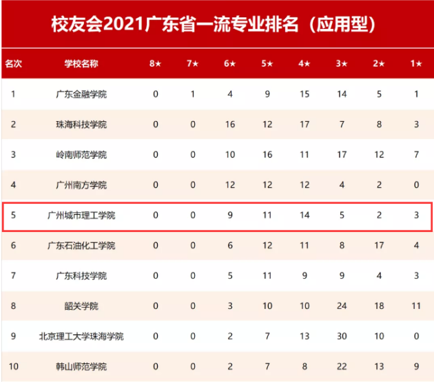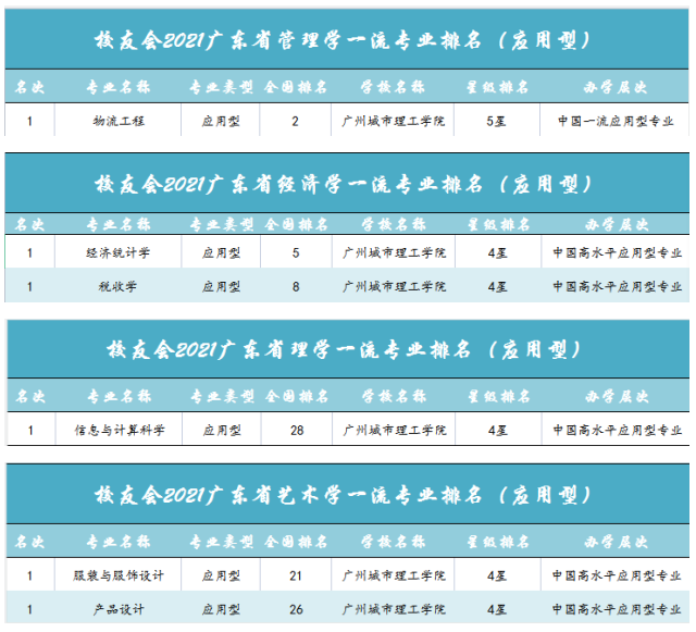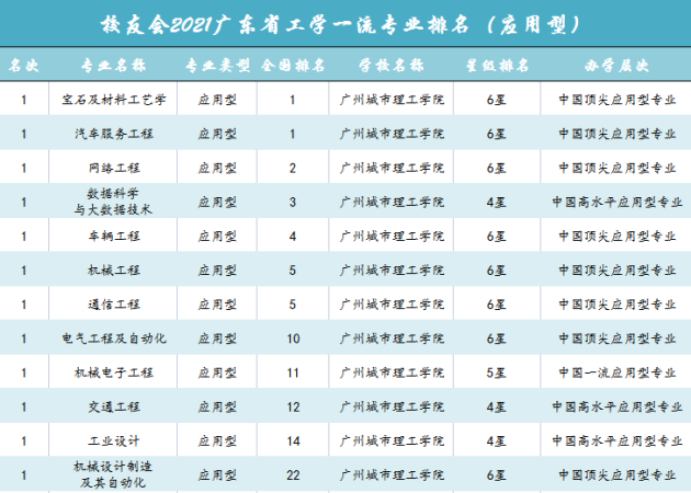 6月11日,艾瑞深校友会网最新发布2021校友会中国一流专业排名、2021广东省一流专业排名和2021广东省各学科门类一流专业排名,在包括公办、民办两类院校的全国所有应用型本科高校中,广州城市理工学院宝石及材料工艺学、汽车服务工程2个专业全国排名第一,网络工程、数据科学与大数据技术等18个专业排名广东省第一,总体排名位列广东省第五。